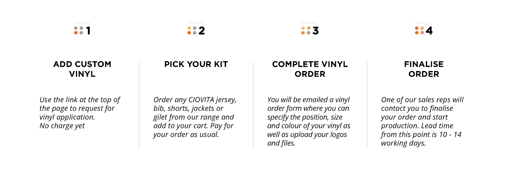 CIOVITA Custom allows us to apply our leading-edge cycling technology to custom kit for individuals, corporate clients and professional teams.